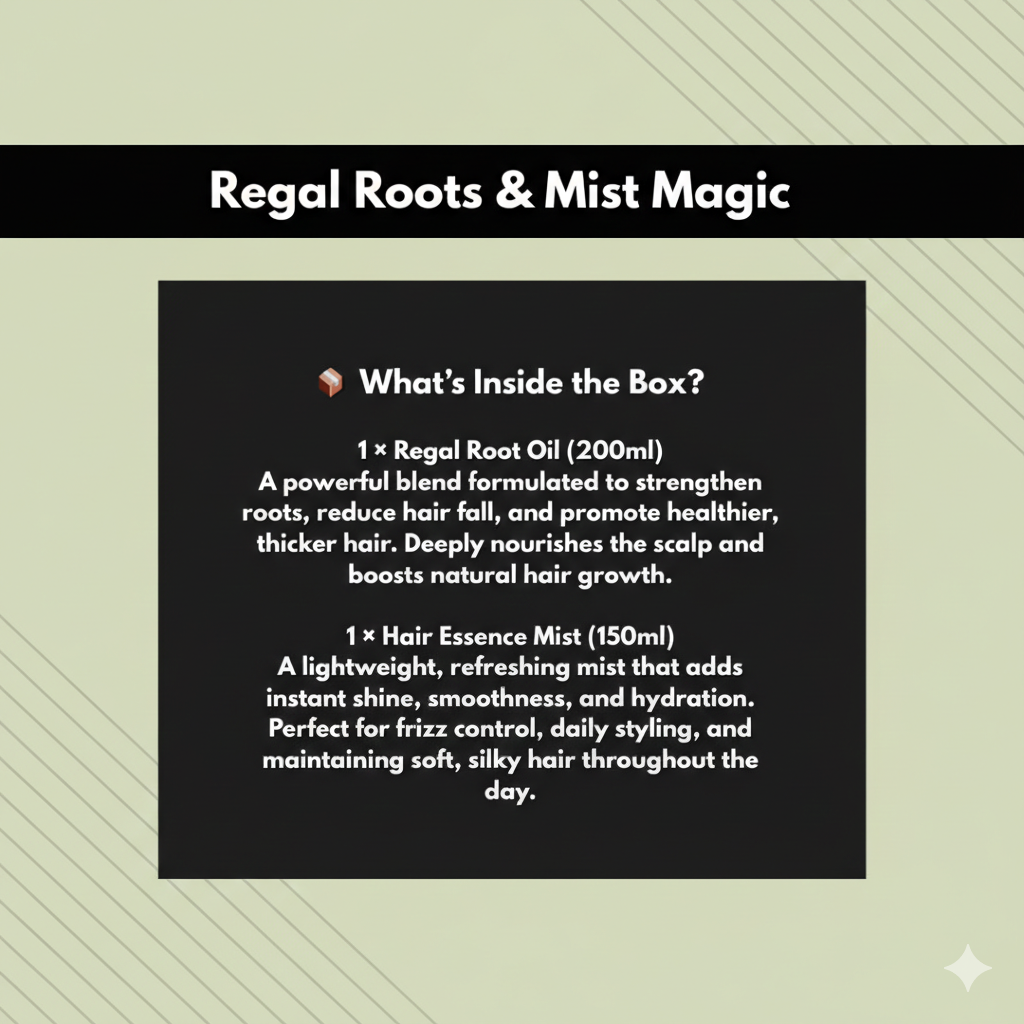Regal Root Oil is a nutrient-rich natural hair growth oil that deeply nourishes the scalp, strengthens follicles, and supports long-term hair growth while reducing hair fall and scalp issues.