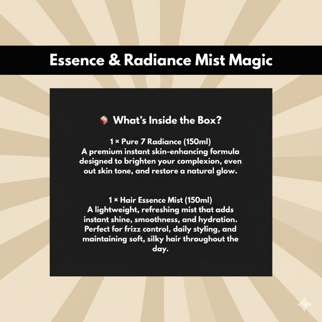 Upgrade your daily beauty routine with Essence & Radiance Mist Magic by Leaf & Luster, a premium hair and skin care combo designed to deliver thicker, healthier hair and naturally glowing, radiant skin. This powerful duo combines Hair Essence Mist and Pure7 Radiance Face Mist, crafted with botanical, chemical-free ingredients for safe, everyday use.